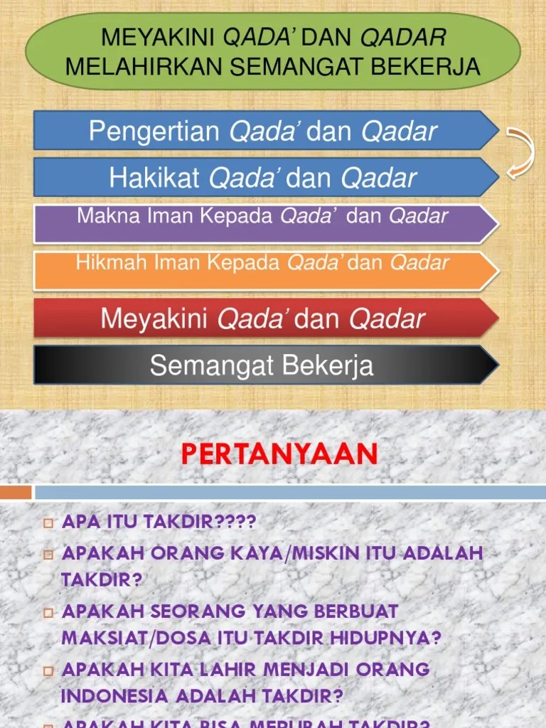 Dan adalah ketetapan allah itu suatu ketetapan yang pasti berlaku. Sebagai umat muslim, wajib hukumnya mempercayai kedua hal ini. Maka, qadar adalah perwujudan atau kenyataan yang akan terjadi . Maksud iman kepada qada dan qadar adalah meyakini sepenuhnya di dalam hati yang tercermin lewat ucapan dan perbuatan bahwa takdir yakni qada . Penurunan dari keyakinan kita terhadap allah swt. Apabila qada merupakan keputusan atau rencana yang telah dituliskan allah swt. Iman kepada hari kiamat dan iman kepada qadha dan qadar. Beriman kepada qada dan qadar termasuk rukun iman ke yang keenam. Iman itu ialah kamu beriman kepada allah s.w.t,kepada hari akhirat . Percaya kepada qada dan qadar adalah rukun iman keenam.